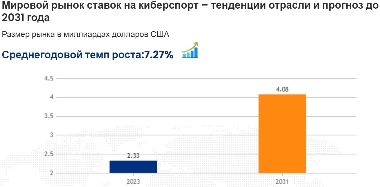 उनकी रिपोर्ट के अनुसार, 2025 के अंत तक ई-स्पोर्ट्स सट्टेबाजी बाजार का अनुमानित मूल्य 16.21 अरब डॉलर होगा। अगले दस वर्षों में इसकी चक्रवृद्धि वार्षिक वृद्धि दर (CAGR) 13.7% रहने की उम्मीद है, जिसका अर्थ है कि 2025 से 2034 के बीच कुल मिलाकर 230% से अधिक की वृद्धि। इस उद्योग को प्रभावित करने वाले सकारात्मक कारकों में कंप्यूटर गेम टूर्नामेंट की बढ़ती संख्या, व्यापक दर्शक वर्ग का इनमें रुझान, तकनीकी प्रगति और ई-स्पोर्ट्स की बढ़ती स्वीकार्यता शामिल हैं। हालांकि, कई देशों में जुए से संबंधित कानूनों का सख्त होना इसके लिए एक नकारात्मक पहलू है।